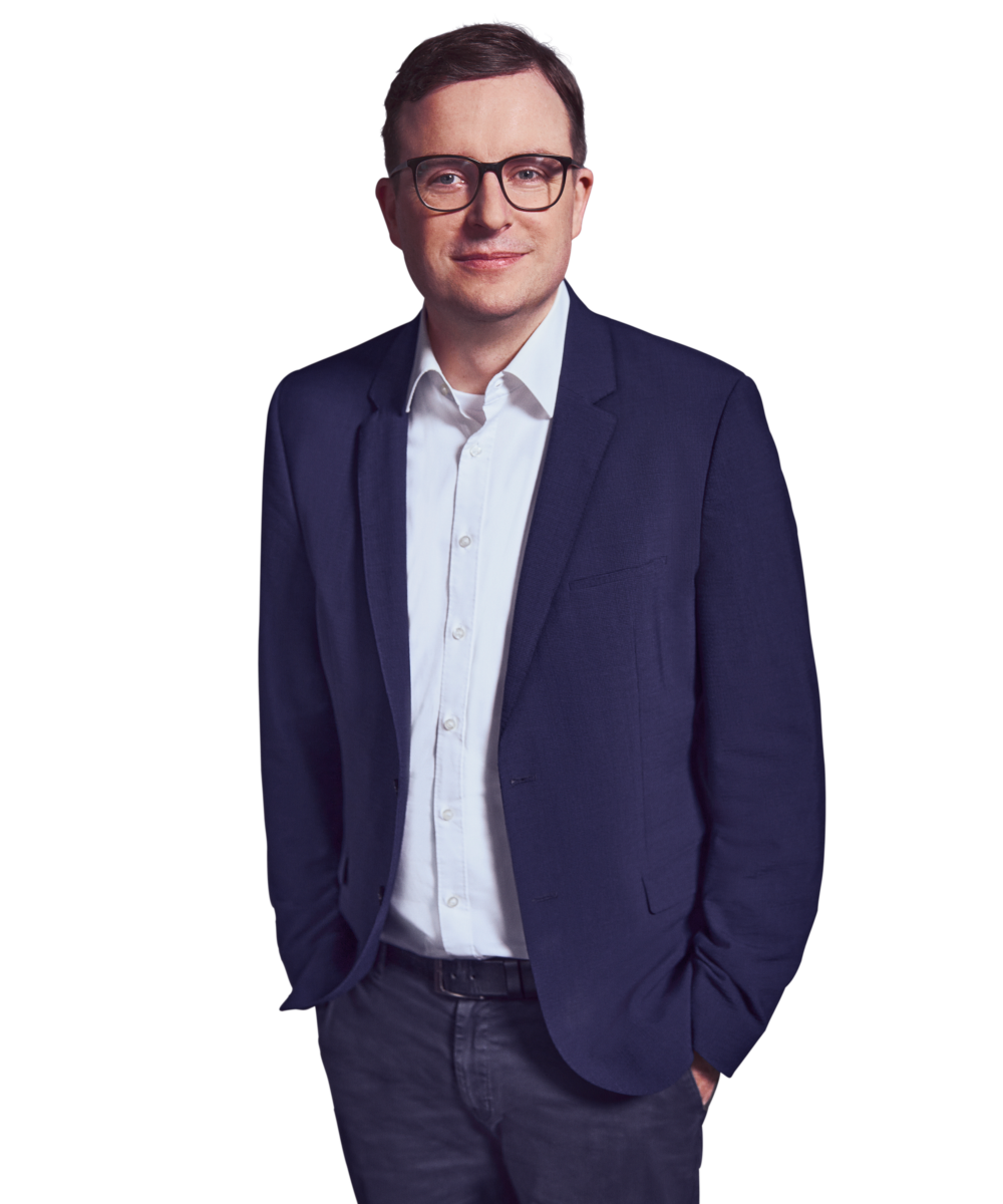 Männliche Person, braune kurze Haare, dunkelblaue Augen mit Brille, lächelnd, trägt ein weißes Hemd und einen dunkelblauen Anzug, stehend mit beiden Händen in den Hosentaschen