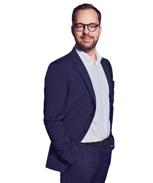Männliche Person, braune kurze Haare, dunkelblaue Augen mit Brille, lächelnd mit Bart, trägt ein weißes Hemd und einen dunkelblauen Anzug, stehend mit beiden Händen in den Hosentaschen